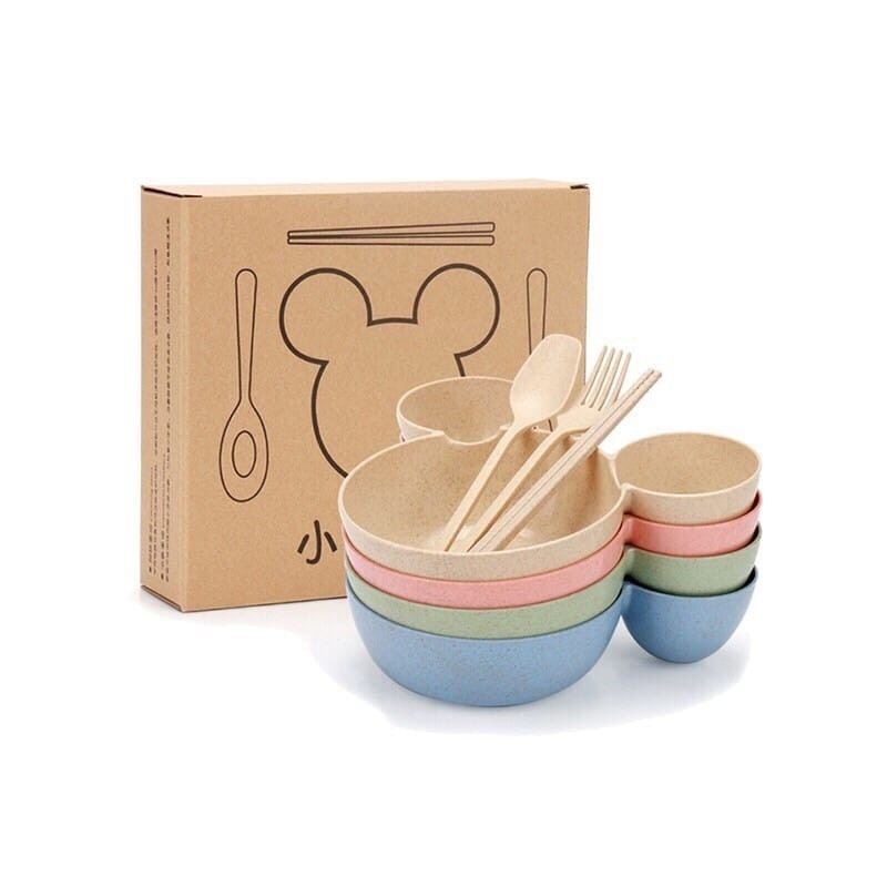 Best Seller Perlengkapan di Kabupaten Bantul Set Alat Makan Anak 4 In 1 Mangkok Mickey Mouse Bahan Jerami Lucu Lengkap Sendok Garpu Sumpit Murah dari Lubaba Shop Kab. Gresik