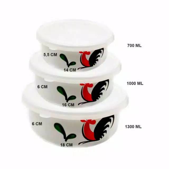 Lengkapi kebutuhan rumah tangga anda dengan mixing Bowl enamel 3 pcs, masing2 dengan tutup plastik yang rapat. Produk kedaung yang teruji awet dan bagus.Yuuuuk segera di order koleksi ayam jago kukuruyuk nya moms Yang di dapatkan:1 mangkok Ukuran 18 cm1 mangkok Ukuran 16 cm1 mangkok ukuran 14 cmJangan lupa tambahkan buble wrap untuk keamanan packing